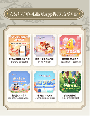 活动期间,用户在华为音乐活动页面安装并打开中国国航APP,即可领取7天华为音乐VIP权益,海量版权音乐随心畅听。在中国国航APP中,还能同步解锁“凤凰知音会员生日礼800元券包”“周四会员日100元机票券”“新用户50元专享礼”“学生党折上折”等权益,参与“来飞行小镇好友互动”可获取专属福利。此外,无理由退票服务升级为“2+2+2安心保障”,让出行更无忧。音乐与旅途的权益叠加,超千元福利堪称“文化旅行爱好者的梦幻礼包”。